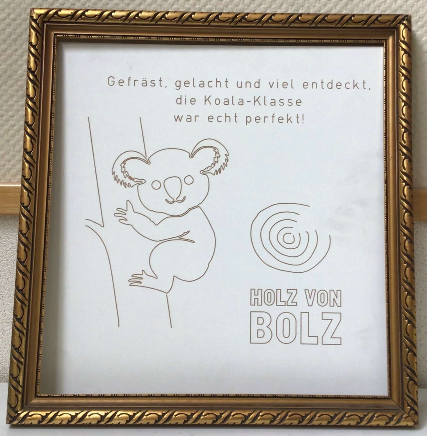 Dann wurden wir ins Hobelwerk geführt. Dort wurden die Feinheiten gemacht. Anschließend sind wir in die kleine Werkstatt für Werkzeuge gegangen. Dort wird das Werkzeug wieder geschärft. Danach liefen wir in die Schreinerei. Es war sehr interessant. Hier stand eine CNC-Fräse. Wir durften zuschauen, wie ein Koalabär in ein Holzbrett reingeschnitzt wurde. Daneben stand noch: Gefräst, gelacht und viel entdeckt, die Koala-Klasse ist echt perfekt!